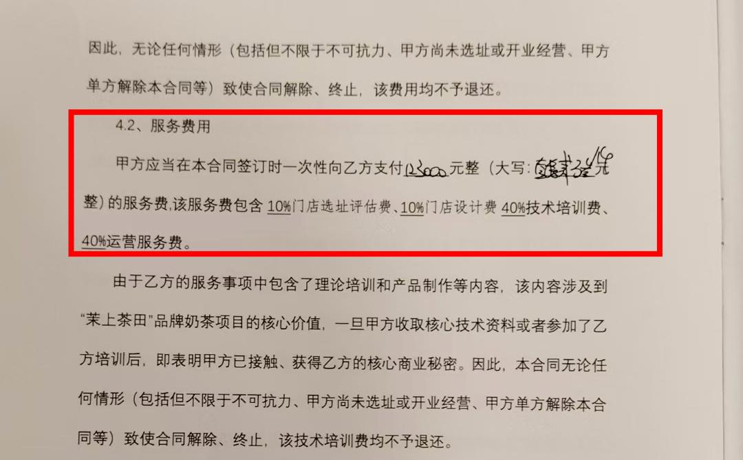 而支付的17.3万元加盟费中,12.3万元用于支付给茉上茶田作为服务费用,该服务费包含10%门店选址评估费、10%门店设计费、40%技术培训费及40%运营服务费。