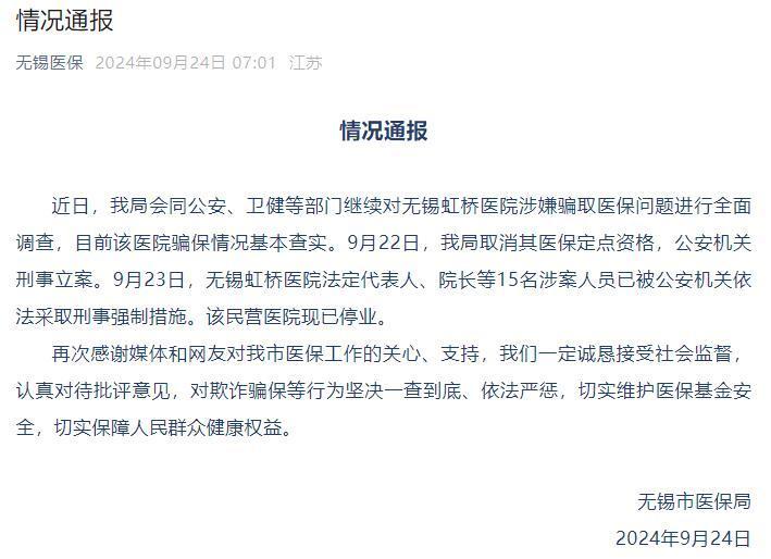 中新网9月24日电 江苏省无锡市医保局24日在官方微信公众号发布情况通报称,近日,无锡市医保局会同公安、卫健等部门继续对无锡虹桥医院涉嫌骗取医保问题进行全面调查,目前该医院骗保情况基本查实。9月22日,无锡市医保局取消其医保定点资格,公安机关刑事立案。9月23日,无锡虹桥医院法定代表人、院长等15名涉案人员已被公安机关依法采取刑事强制措施。该民营医院现已停业。
