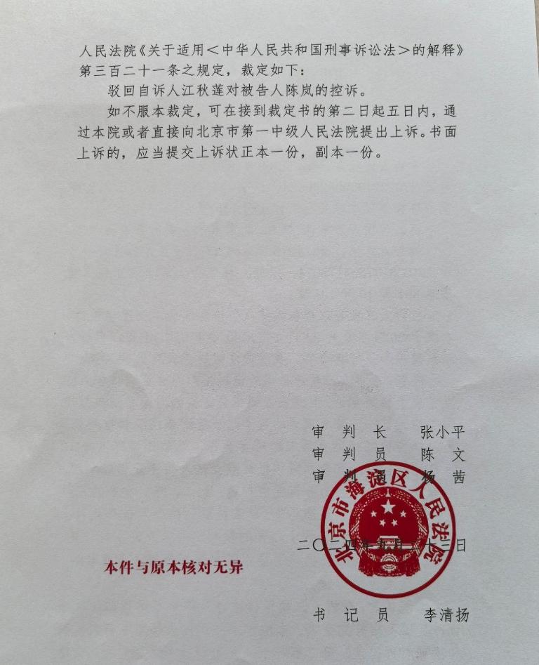 北京市海淀区法院刑事裁定书显示,江秋莲以被告人陈岚犯诽谤罪向法院提起控诉,海淀区法院于2023年9月22日立案。2024年5月21日,江秋莲追加了控诉事实。法院依法组成合议庭进行审查。