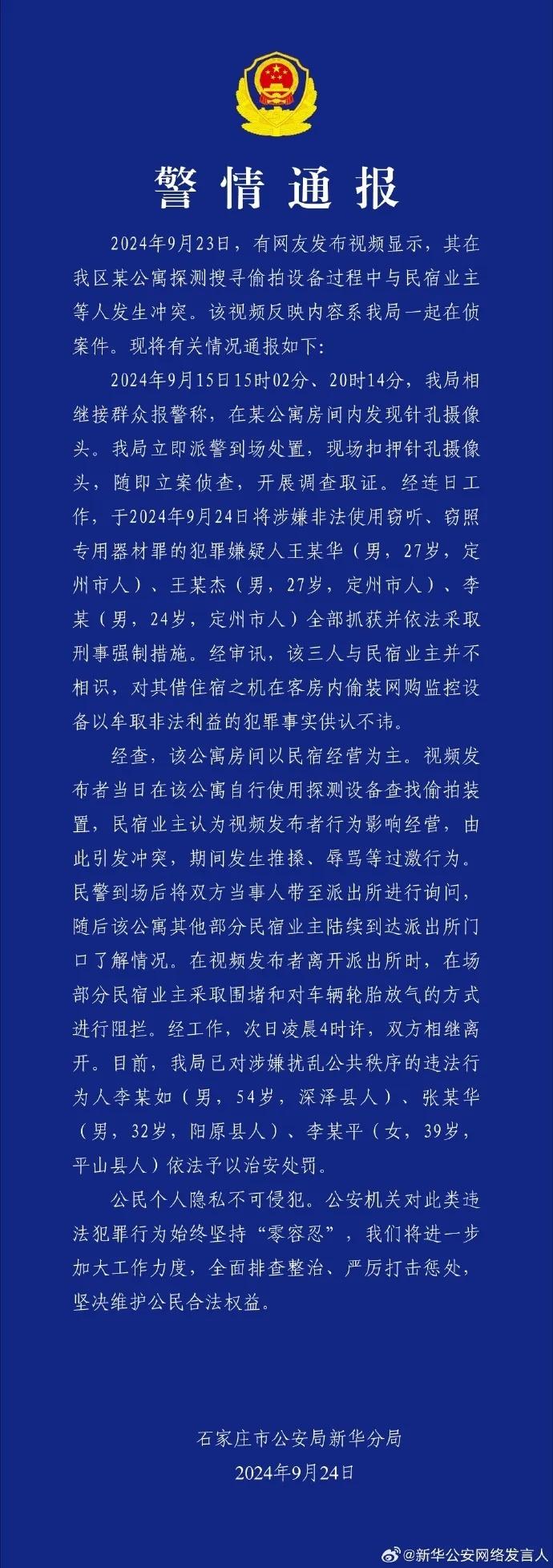 9月24日,石家庄市公安局新华分局发布警情通报,于2024年9月24日将涉嫌非法使用窃听、窃照专用器材罪的犯罪嫌疑人王某华(男,27岁,定州市人)、王某杰(男,27岁,定州市人)、李某(男,24岁,定州市人)全部抓获并依法采取刑事强制措施。