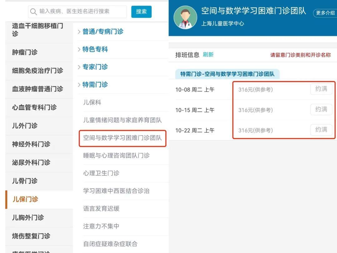 记者在官方预约挂号渠道查询看到,“空间与数学学习困难门诊”系特需门诊,挂号费316元(供参考),首批开放名额分别在10月8日、10月15日和10月22日。目前,这三天的就诊号源已经全部约满。