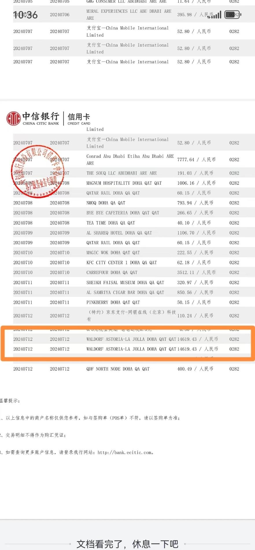 然而,等张先生回国向中信银行核实交易情况却发现,自己确实被扣了双倍房费。张先生提供的银行流水截图显示,实际发生且入账的交易确实为两笔14619.43元的酒店客房费。