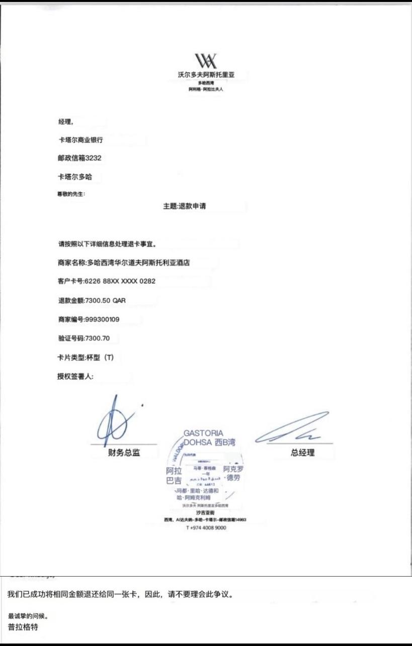 对此,记者联系卡塔尔多哈西湾华尔道夫阿斯托利亚酒店询问退款细节,截至发稿前,未获回应。