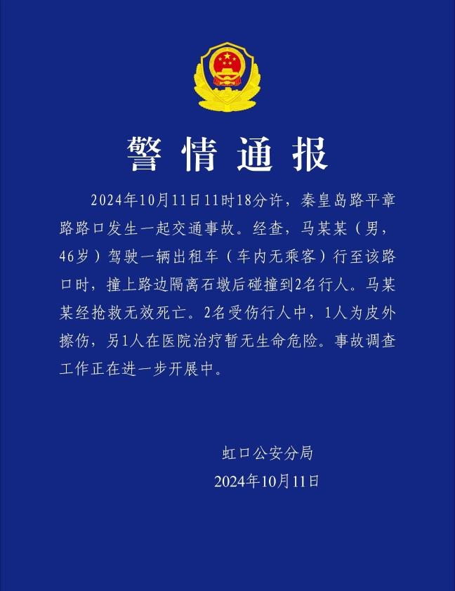 10月11日,记者从上海市公安局虹口分局获悉:2024年10月11日11时18分许,秦皇岛路平章路路口发生一起交通事故。经查,马某某(男,46岁)驾驶一辆出租车(车内无乘客)行至该路口时,撞上路边隔离石墩后碰撞到2名行人。马某某经抢救无效死亡。2名受伤行人中,1人为皮外擦伤,另1人在医院治疗暂无生命危险。事故调查工作正在进一步开展中。