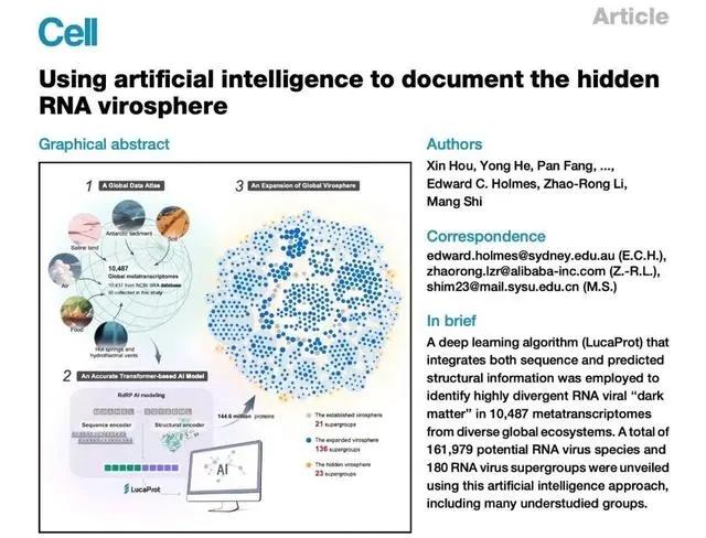 这项经过同行评审的研究10日发表在国际知名学术期刊《细胞》(Cell)上。研究的共同通讯作者[1] 中山大学医学院施莽教授告诉澎湃新闻:“人工智能算法模型使我们能够挖掘出以前未知或被忽视的病毒。这种能力在疾病控制和快速识别新病原体方面尤为重要。”