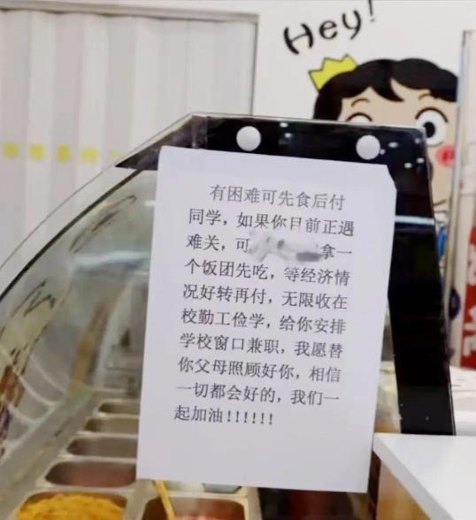 “同学,如果你目前正遇难关,可以拿一个饭团先吃,等经济情况好转再付。”近日,河南师范大学一食堂窗口的暖心告示“火了”。除了爱心饭团、先吃后付,学校还招募同学勤工俭学,安排在食堂窗口兼职。这样“授人以鱼”和“授人以渔”双管齐下,让不少网友感到暖心,“小小的细节最打动人心”。