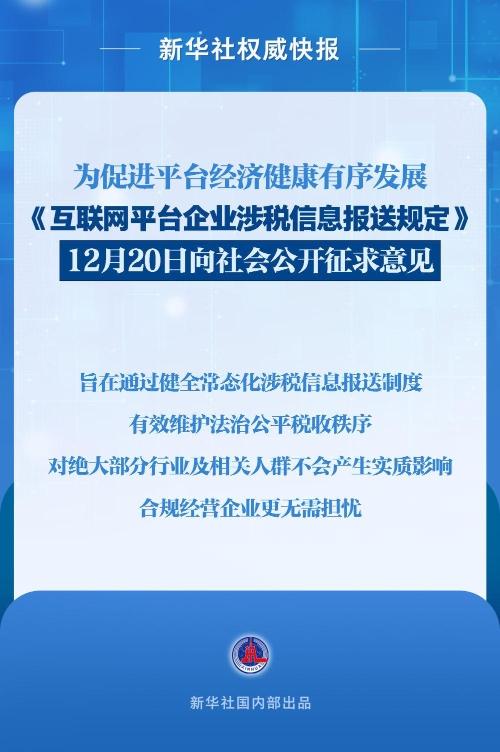 《互联网平台企业涉税信息报送规定》12月20日向社会公开征求意见。