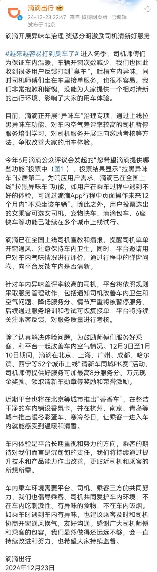 12月23日,@滴滴出行发文回应此事。滴滴称,进入冬季,司机师傅们为保证车内温暖,车辆开窗次数减少,滴滴也因此收到很多用户反馈打到“臭车”,吐槽车内异味。