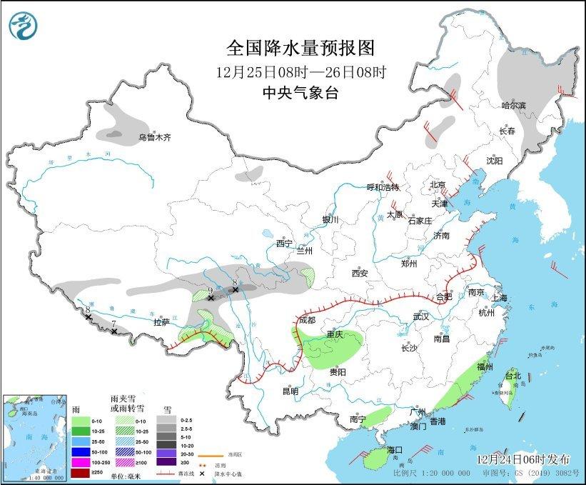 12月25日08时至26日08时,新疆沿天山地区和伊犁河谷、西藏南部和东北部、青海南部、甘肃南部、川西高原北部、内蒙古东部、黑龙江大部、吉林东部等地部分地区有小到中雪或雨夹雪,其中,西藏南部和东北部、青海南部等地局地有大雪(5~9毫米)。西藏东南部、四川盆地南部、重庆东南部、贵州中北部、云南东北部、广西东南部、广东东部、福建东部、海南岛、台湾岛等地部分地区有小雨。内蒙古中东部、山西北部、河北北部、天津、辽宁西部、黑龙江东部等地部分地区有4~6级风;渤海、渤海海峡、黄海北部海域、东海南部海域、台湾以东洋面有4~6级、阵风7级大风,台湾海峡、巴士海峡、南海北部海域有5~7级、阵风8级大风。