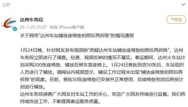 中新网1月26日电 成都铁路局达州车务段25日晚在官方微博发布情况通报称,1月24日晚,针对网友发布视频称“质疑达州车站铺放座椅垫拍照后再拆除”,达州车务段立即进行了调查。