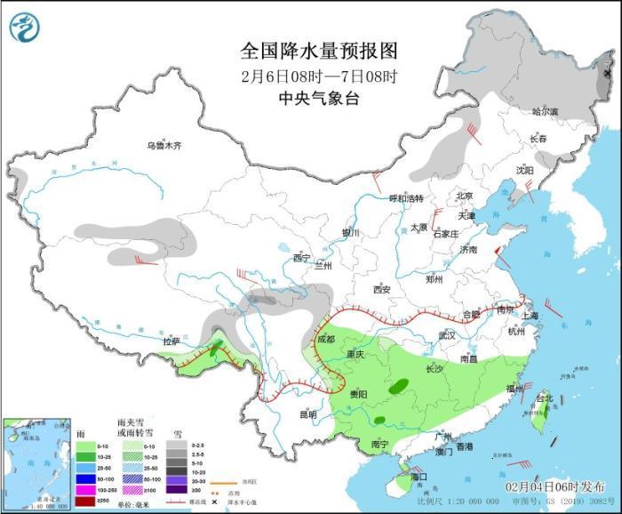 2月6日08时至7日08时,内蒙古中东部、黑龙江、吉林东南部、新疆南部、西藏北部和东南部、川西高原北部等地部分地区有小雪或雨夹雪,其中,黑龙江东北部等地部分地区有中到大雪(5~7毫米)。西藏东南部、江南大部、西南地区东部、华南大部、海南岛东部、台湾岛等地部分地区有小雨,其中,西藏东南部、湖南西南部、广西北部、台湾岛东部等地部分地区有中雨。内蒙古中西部、西藏中北部、青海南部、华北北部和西部等地部分地区有4~6级风;黄海大部、东海北部、台湾海峡、巴士海峡、南海北部海域有7~8级风,阵风9~10级。