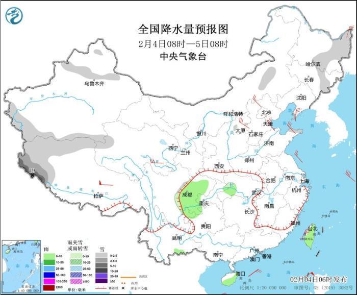 2月4日08时至5日08时,新疆西部和沿天山地区、西藏西部和北部、内蒙古中部、黑龙江东部、吉林东部、山东半岛北部等地部分地区有小雪或雨夹雪,其中,西藏西部部分地区有中到大雪,局地暴雪(10~19毫米)。四川东部、重庆西部、湖北西部、海南岛南部、台湾岛等地部分地区有小雨。内蒙古大部、西藏中北部、青海南部、宁夏北部、陕西北部、华北西部和北部等地部分地区有4~6级风。渤海、黄海、东海、台湾海峡、台湾以东洋面、巴士海峡、南海大部海域有7~8级风,阵风9~10级。