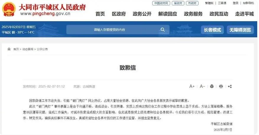 中新网2月7日电 据大同平城区政府网站消息,2月7日,山西大同平城区古城街道发布致歉信:因我街道工作方法失当,引起“破门亮灯”网上热议,占用大量社会资源,在此向广大社会各界朋友表示诚挚的歉意。
