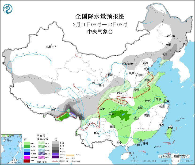 2月11日8时至12日8时,内蒙古东北部、东北地区大部、西藏东部、甘肃南部、西北地区东部、华北北部、黄淮北部、川西高原、重庆东北部、云南西北部等地部分地区有小到中雪或雨夹雪,其中,西藏东部、云南西北部等地部分地区有大到暴雪。黄淮南部、江淮、江汉大部、江南北部和西部、西南地区东部、华南中北部和南部、台湾岛大部等地部分地区有小到中雨,其中,西藏东南部、湖南西部等地部分地区有大雨。内蒙古大部、西北地区东部、华北北部、东北地区西部等地部分地区有4~6级风。