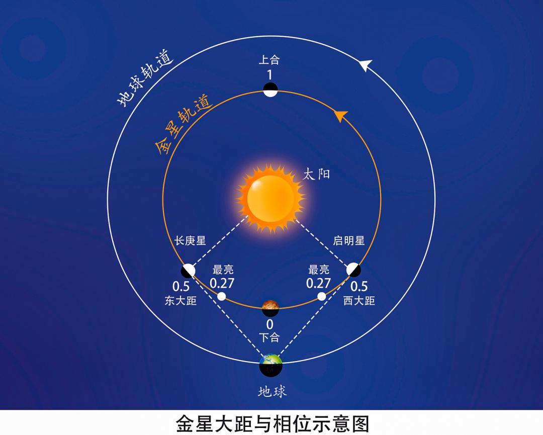 近期,金星在天空中的运行情况如何?从“金星大距与相位示意图”可以看到,今年1月10日,金星“东大距”,即金星位于太阳的东面,与太阳的角度距离最大,达到47°。此时,太阳、金星和地球排列成一个直角三角形,金星在直角处。日落后,在西方天空可见耀眼迷人的金星,也叫“长庚星”。此时,金星的“相位”为0.5,如果采用望远镜观测,金星犹如“半边明月”。