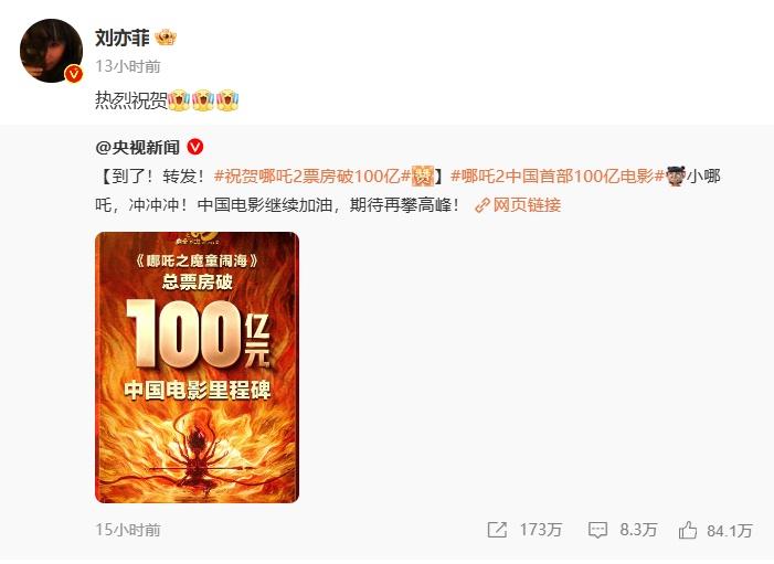 郭帆、贾樟柯、贾玲、刘亦菲、张雨绮等多位娱乐圈的导演、艺人发文祝贺。