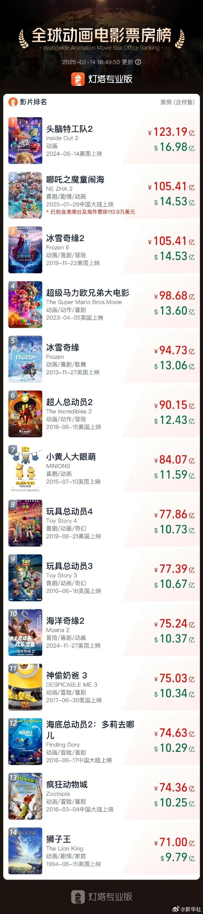 据网络平台数据(灯塔专业版),《哪吒之魔童闹海》总票房(含预售)已超105.41亿元,位列全球动画电影票房榜第2位,全球影史票房榜第14位。