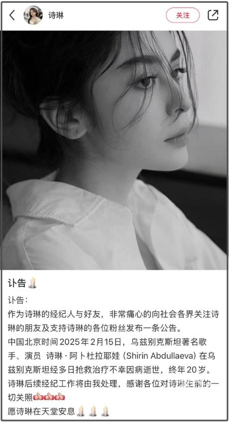 2月16日,诗琳经纪人陈倩在社交平台发布讣告:
