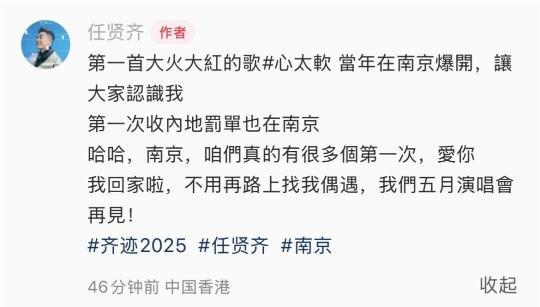 2月19日,知名歌手任贤齐在个人社交平台发视频,自曝在南京骑摩托车被开罚单。