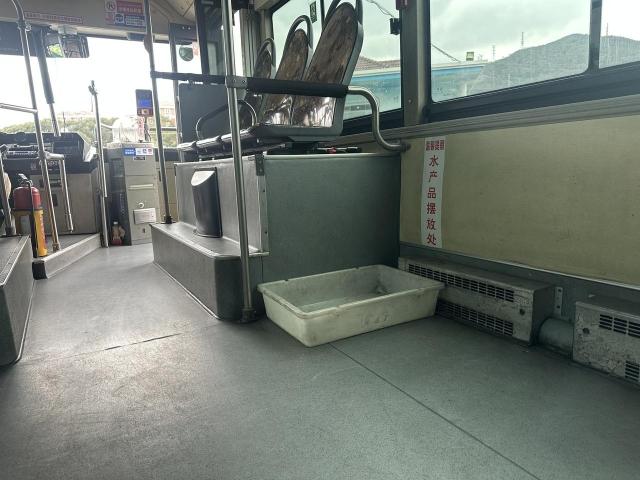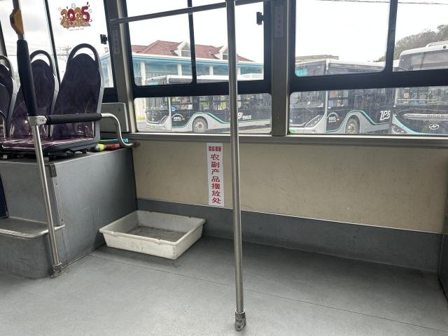 这样一个自发的好点子得到了公交公司的肯定和支持,统一给经过水产城一带的公交线路都配了一个塑料筐,尺寸更大也更能装,还划分出了专门的车厢位置,设置温馨提醒告知乘客。