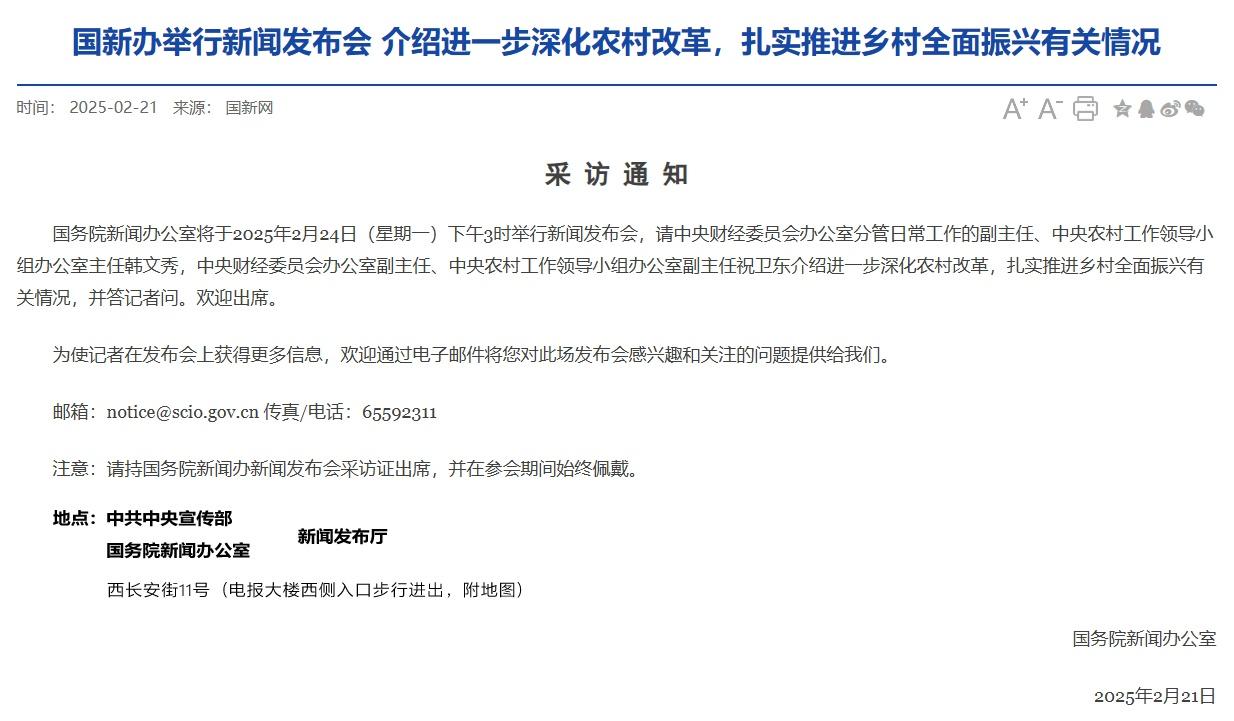 据国新办官网发布,国务院新闻办公室将于2025年2月24日(星期一)下午3时举行新闻发布会,请中央财经委员会办公室分管日常工作的副主任、中央农村工作领导小组办公室主任韩文秀,中央财经委员会办公室副主任、中央农村工作领导小组办公室副主任祝卫东介绍进一步深化农村改革,扎实推进乡村全面振兴有关情况,并答记者问。