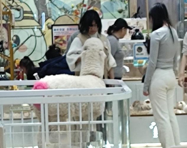 在另一家商场的“萌宠馆”,一只高大的、尾巴染色的白色羊驼孤零零地站在大约四平方米大小的护栏内。周围的小朋友,从它身边经过,有时候会看看它,有时候伸手想摸摸它。羊驼会下意识地躲避,站累了,就跪倒在地。原产南美安第斯山脉地区的羊驼,需要干燥、凉爽、通风的环境。