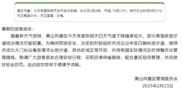 23日18时许,黄山风景区管委会公告称,据最新天气预报,黄山风景区今天夜里到明天白天气温下降幅度较大,部分高海拔游步道结冰情况可能较重。敬请广大游客朋友合理安排行程,采取防滑保暖措施,配合景区现场管理,共同做好安全防范。由此给您带来不便请予谅解。