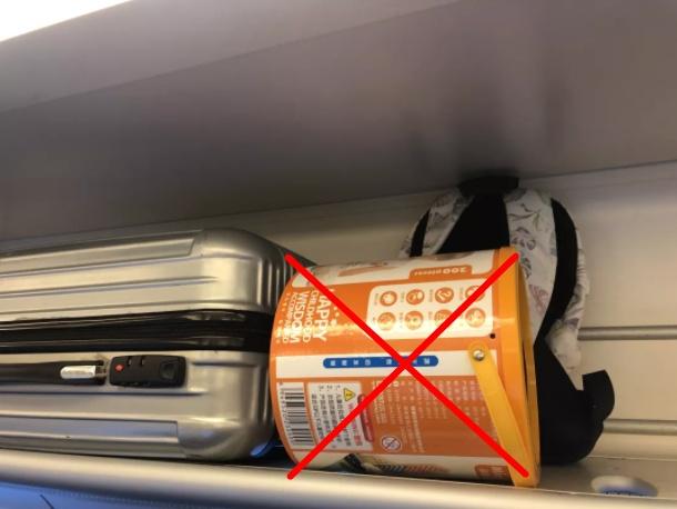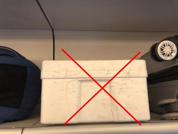 装有生鲜食品的泡沫盒也不能放在行李架上,以免汁水滴落弄脏自己和他人的衣物。