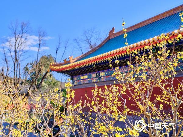 在北京,国家植物园卧佛寺的蜡梅正处于最佳观赏期,寺内有数个品种百余株蜡梅,阳光下的玲珑花瓣金光闪闪,在红墙绿瓦的衬托下更显娇俏明艳,今年蜡梅整体花期将持续至3月中下旬。