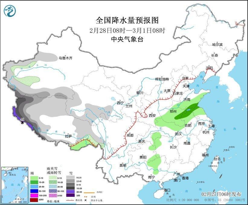 2月28日08时至3月1日08时,新疆南疆西部山区、西藏西部等地部分地区有中到大雪,其中,西藏西部部分地区有大暴雪,局地特大暴雪(30~45毫米)。黄淮大部、江淮北部、江汉东部等地部分地区有小到中雨,局地有大雨。黑龙江东北部部分地区有4~5级风。
