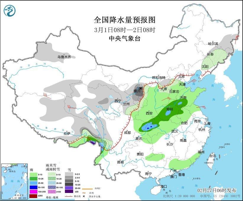 全国降水量预报图(2月28日08时-3月1日08时)。图片来源:中央气象台网站