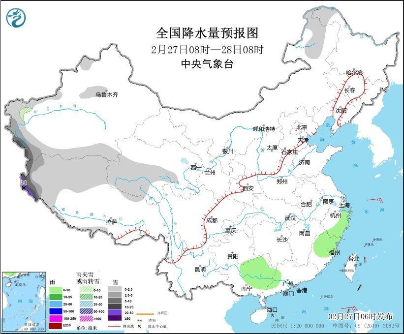 2月27日08时至28日08时,内蒙古东北部、黑龙江西北部、新疆西部、西藏西部和北部、青海南部等地部分地区有小到中雪或雨夹雪,其中,新疆南疆西部山区、西藏西部等地部分地区有大到暴雪,局地大暴雪(20~30毫米)。浙江东部、福建北部、广西中东部等地部分地区有小雨。