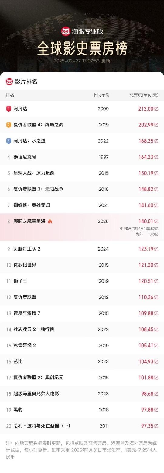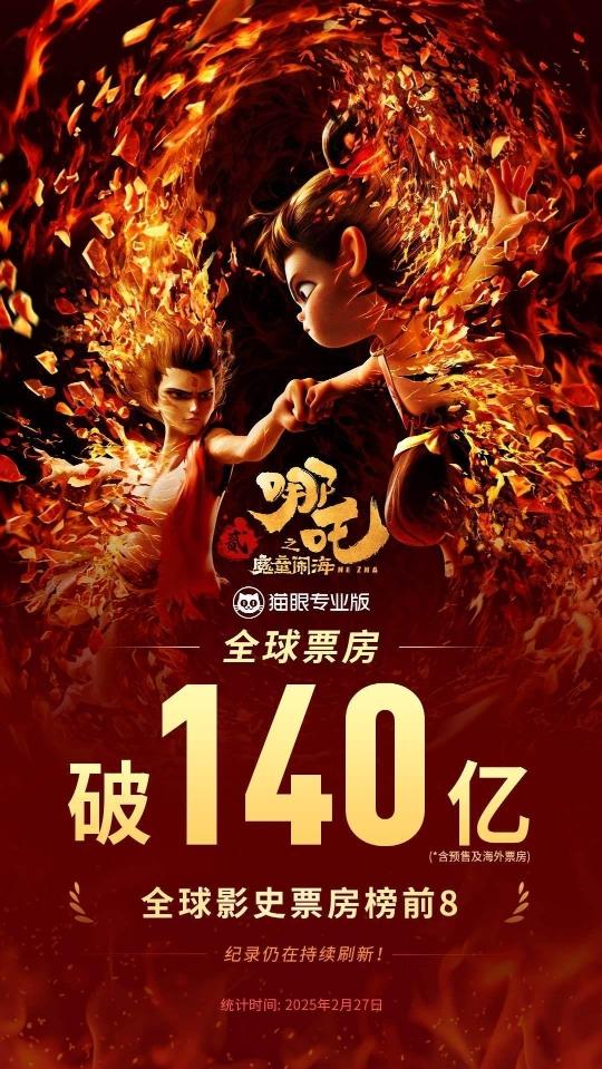 据猫眼专业版数据,《哪吒之魔童闹海》全球票房(含预售及海外)破140亿,冲击全球票房榜第7!