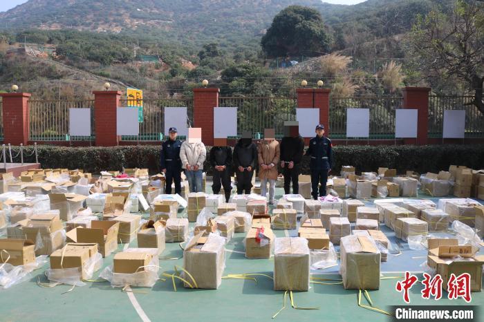 漳州海警在龙海查获的涉案人员及“台杂货”。漳州海警局供图