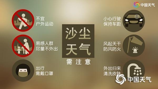 沙尘天气对人体健康、交通出行等方面有不利影响。建议上述地区公众在沙尘来临时尽量减少外出,如果必须外出,应佩戴口罩、防风镜等用品,做好健康防护,回家及时清洗面部和鼻腔;如果驾车出行,需打开车灯,保持距离,减速慢行。