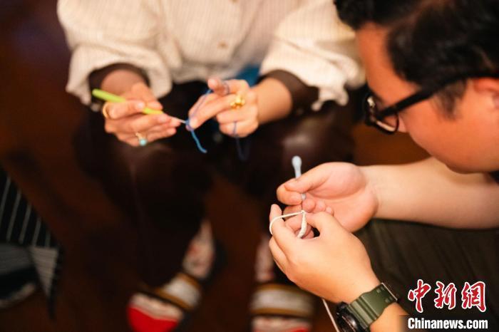“笋加鲜”组织的“技能交换”饭局上,参与者学习毛线编织。(受访者供图)