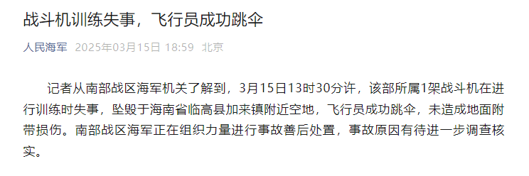 记者从南部战区海军机关了解到,3月15日13时30分许,该部所属1架战斗机在进行训练时失事,坠毁于海南省临高县加来镇附近空地,飞行员成功跳伞,未造成地面附带损伤。南部战区海军正在组织力量进行事故善后处置,事故原因有待进一步调查核实。