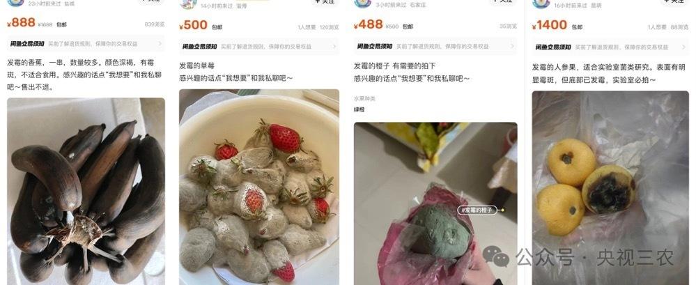 此举引发很多网友跟风,把自家发霉的水果留起来,拍照发在二手物品交易平台上。目前在该平台搜索关键词“发霉水果”,会看到各种毛茸茸的霉变水果,市场均价“666”。
