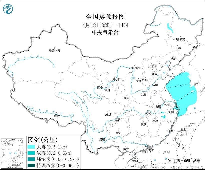 预计,4月18日白天至夜间,黄海中部和南部海域、东海北部海域、长江口及杭州湾附近海域、舟山群岛附近海域、青岛港、上海港、宁波港将有大雾;此外,4月18日早晨至上午,安徽南部、江西东部、浙江西部、黑龙江西部、内蒙古东北部等地的部分地区有能见度不足1公里的大雾,局地有能见度不足500米的浓雾。