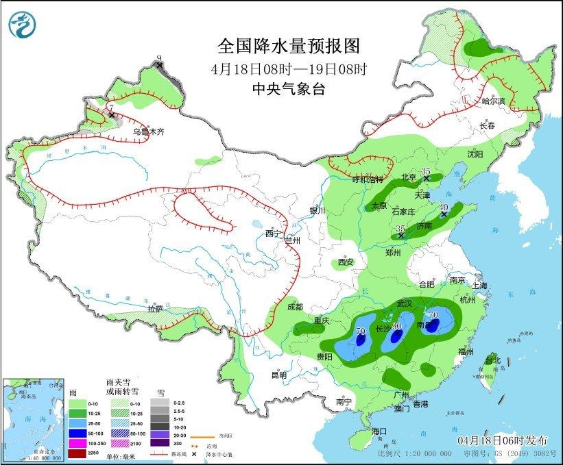 全国降水量预报图(4月18日08时-19日08时)。图片来源:中央气象台网站
