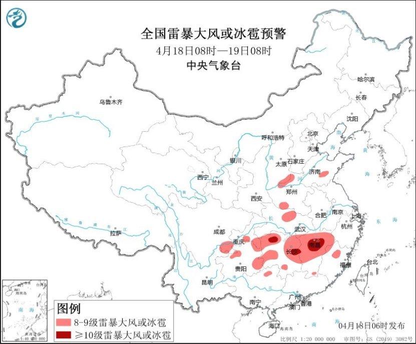 全国雷暴大风或冰雹预警图(4月18日08时-19日08时)。图片来源:中央气象台网站
