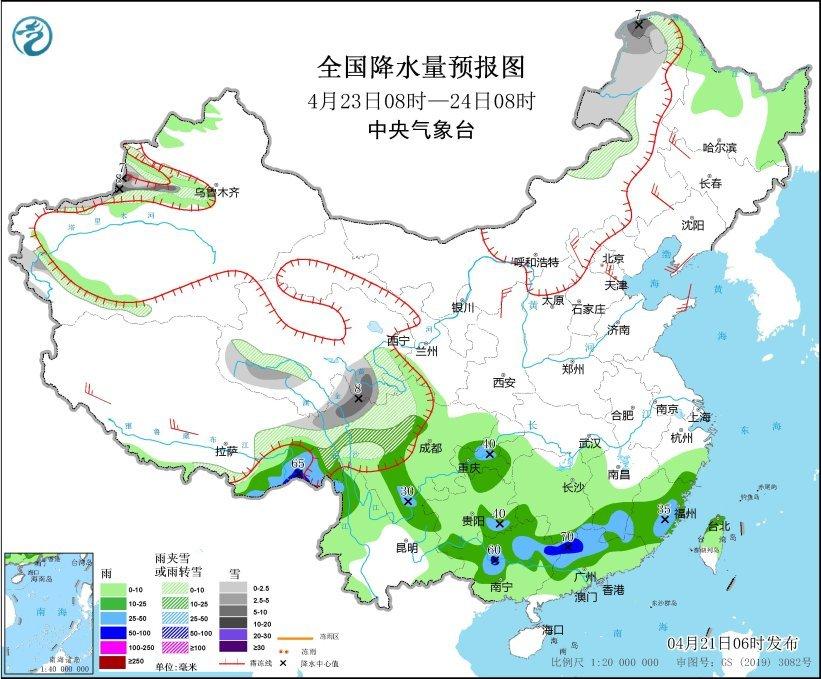 4月23日08时至24日08时,内蒙古东北部、黑龙江西北部、新疆伊犁河谷和南疆西部山区、西藏东部、青海南部和西部、川西高原等地部分地区有小到中雪或雨夹雪,局地有大雪(5~8毫米)。西藏东南部、四川南部、重庆中南部、贵州北部和东南部、云南北部以及江南南部、华南北部等地部分地区有中到大雨,其中,西藏东南部、广西中部和东部、广东西北部等地部分地区有暴雨(50~70毫米)。西藏南部和西部、内蒙古中东部、吉林西部、辽东半岛、陕西北部、河北北部、天津中部、山东半岛等地部分地区有4~5级风。