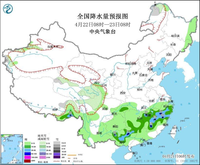 4月22日08时至23日08时,内蒙古东北部、黑龙江西北部、新疆西部山区、西藏东部、青海南部和西部、甘肃南部、四川盆地北部等地部分地区有小雪或雨夹雪,局地有大雪(5~6毫米)。西藏东南部、江南中东部、华南西部等地部分地区有中到大雨,其中,西藏东南部、江西东部和西北部、浙江西部、福建西北部、广西北部等地部分地区有暴雨(50~70毫米)。西藏南部、内蒙古、辽东半岛、天津中部、山东半岛、江苏南部等地部分地区有4~6级风。