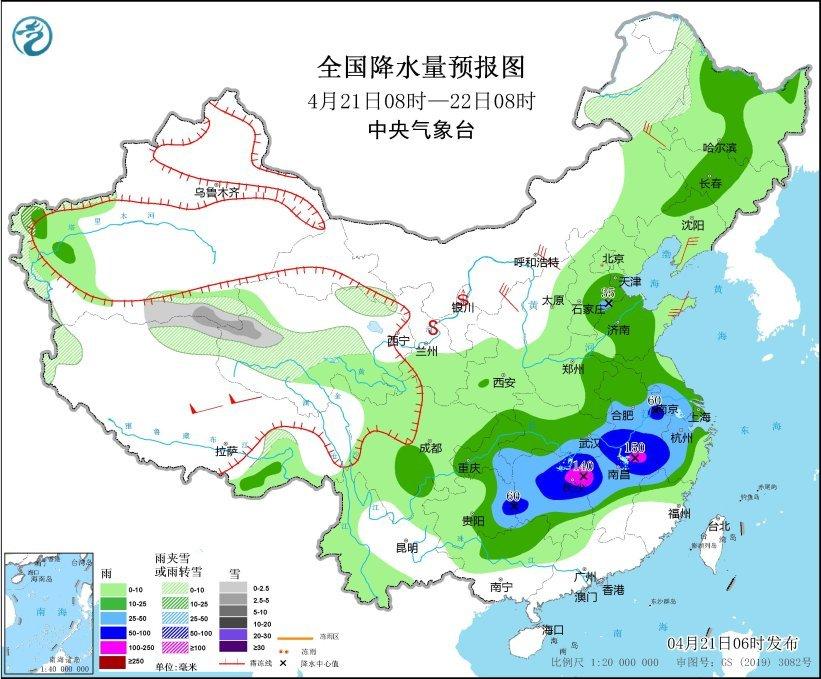 4月21日08时至22日08时,内蒙古东北部、黑龙江西北部、新疆南疆盆地和西部山区、西藏北部、青海北部和西部等地部分地区有小到中雪或雨夹雪。东北地区中部、华北东部、黄淮东部、江淮、江汉、江南大部、华南北部以及四川东南部、重庆、贵州东部等地部分地区有中到大雨,其中,安徽中南部、湖北东北部、湖南中北部、江西北部、浙江中西部、贵州东部等地部分地区有暴雨或大暴雨(100~150毫米)。西藏北部、内蒙古中东部、陕西北部、辽东半岛、山东半岛等地部分地区有5~6级风,阵风7~8级。