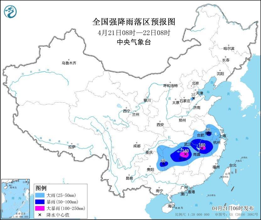 中央气象台4月21日06时继续发布暴雨蓝色预警、强对流天气蓝色预警:预计,4月21日08时至22日08时,贵州东部、重庆东南部、湖北东部和南部、湖南中北部、江西北部、安徽中南部、江苏西南部、浙江西部、福建西北部以及河北东南部等地部分地区有大到暴雨,其中,湖南东北部、江西北部等地局地有大暴雨(100~150毫米)。上述部分地区伴有短时强降水(最大小时降雨量30~50毫米,局地可超过70毫米);江汉东部、江淮西南部、江南中北部、西南地区东部等地的部分地区将有8级以上雷暴大风或冰雹天气,其中,安徽南部、湖北东南部、湖南东北部、江西北部等地的部分地区将有10级以上雷暴大风。