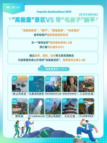 年轻人“五一”假期有什么新玩法?有人想要找“高能量”景区充电疗愈,有人只想带着宠物“毛孩子”躺平。“高能量景区”“躺平”“携宠度假”、“电竞酒店”是年轻用户搜索量最高的热词。