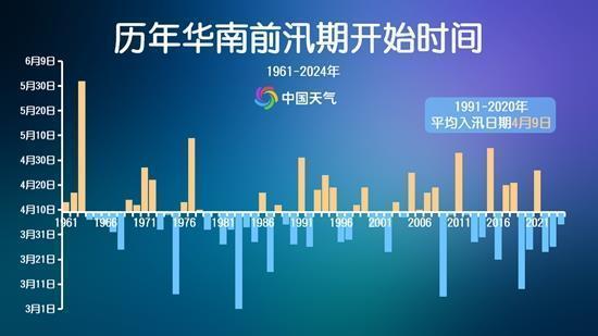 中国天气网统计了1961年至2024年的大数据发现,今年华南前汛期开启时间虽偏晚,但还不算最晚的。历史上,1963年华南前汛期开启时间最晚,6月1日才姗姗来迟;1983年最早,在3月1日就早早到来。