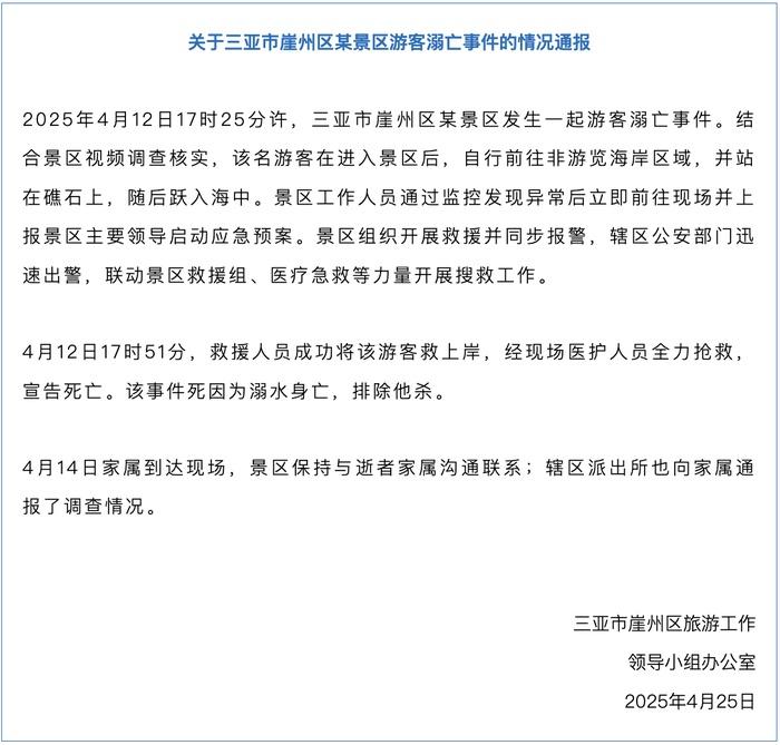 4月25日,三亚市崖州区旅游工作领导小组办公室发布关于三亚市崖州区某景区游客溺亡事件的情况通报。