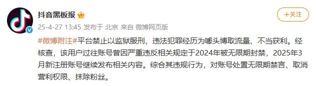 4月27日,@抖音黑板报 发布微博称,平台禁止以监狱服刑、违法犯罪经历为噱头博取流量、不当获利。经核查,该用户过往账号曾因严重违反相关规定于2024年被无限期封禁,2025年3月新注册账号继续发布相关内容。综合其违规行为,对账号处置无限期禁言、取消营利权限、抹除粉丝。
