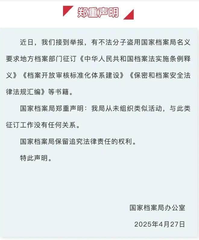 近日,国家档案局接到举报,有不法分子盗用国家档案局名义要求地方档案部门征订《中华人民共和国档案法实施条例释义》《档案开放审核标准化体系建设》《保密和档案安全法律法规汇编》等书籍。国家档案局郑重声明:国家档案局从未组织类似活动,与此类征订工作没有任何关系。